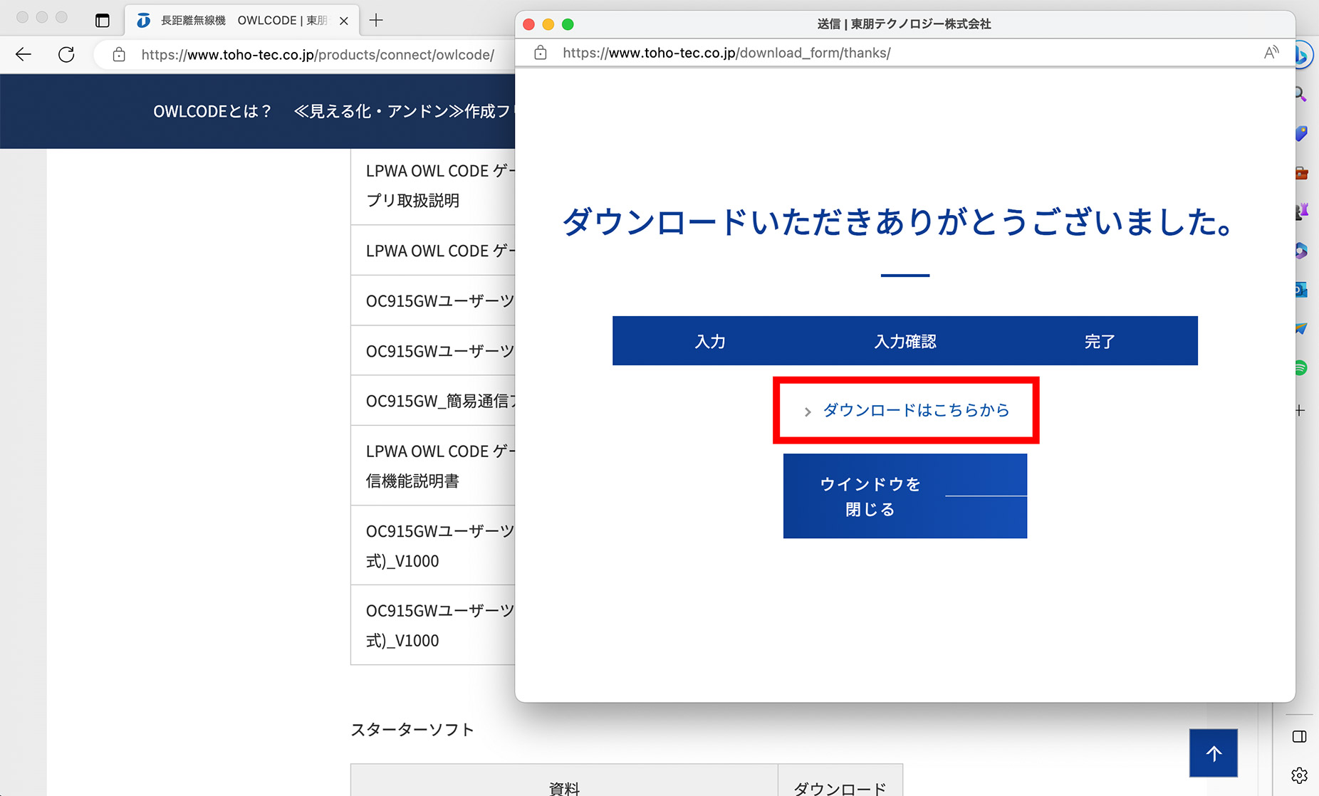 ダウンロードのポップアップが⽴ち上がります。この時、「ダウンロードはこちら」をクリックしても何も起きないように⾒えることがあります。
